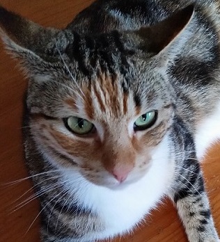 A prettily marked female cat with a red tabby face, grey tabby back, and white socks and underbelly. Looking cross.