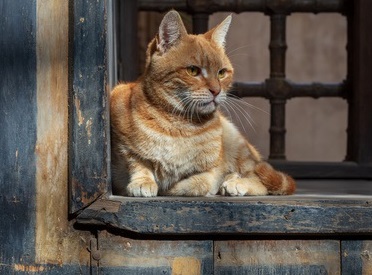 The print-shop cat was sitting by his window.