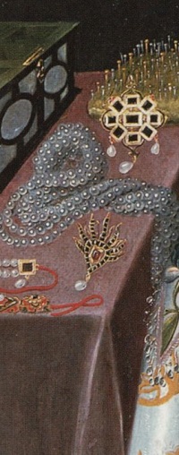 The fur-trimmed red robe lying beside her is that of a countess, to be worn on state occasions. Her ruff, with a jewelled front for her bodice, is pinned to the curtain behind her. On the table is a fine display of jewellery, and a pin-cushion with all the pins required to hold a grand Elizabethan lady’s formal attire together.